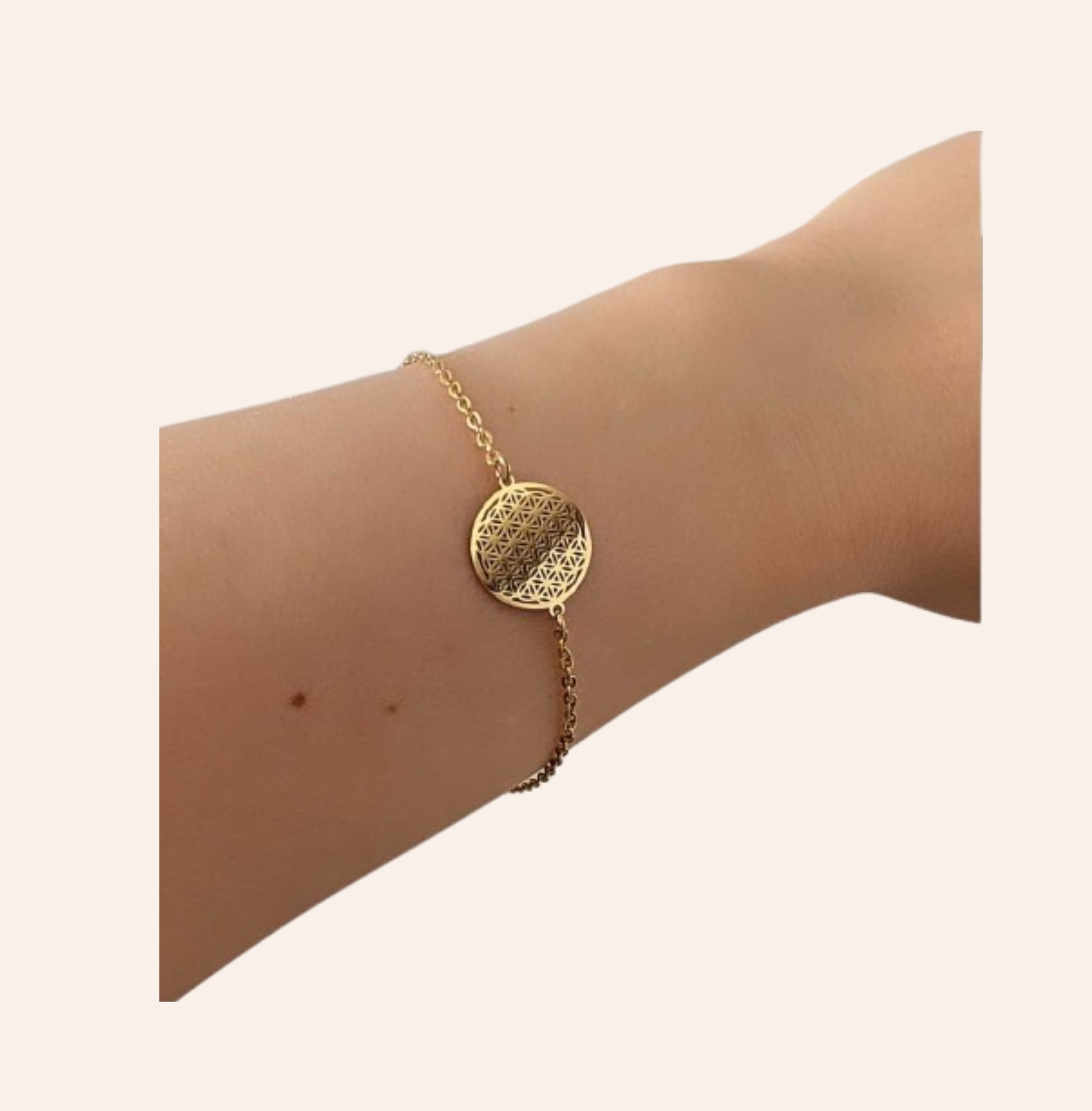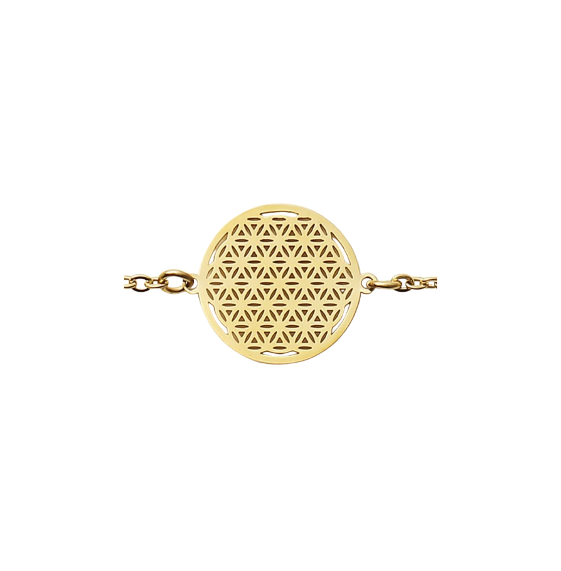 Dieses edle Armkettchen in Gold vereint filigranes Design mit spiritueller Tiefe. Im Mittelpunkt steht die Blume des Lebens – ein kraftvolles Symbol für Schutz, Lebensenergie und Harmonie.
