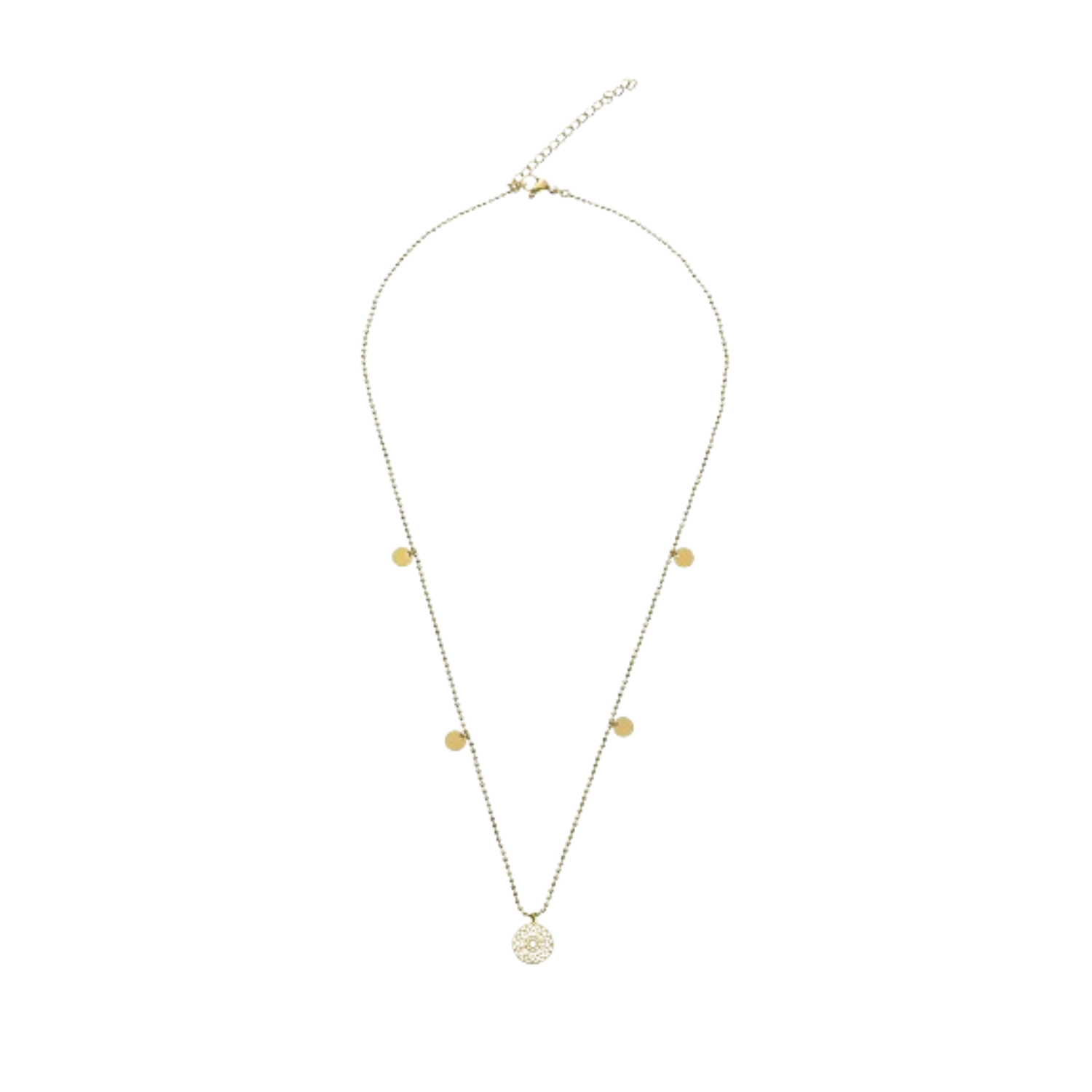 Diese wunderschöne Halskette in Silber vereint filigrane Eleganz mit spiritueller Symbolik. Der detailreiche Mandala-Anhänger (Ø ca. 9 mm) steht für innere Ruhe, Glück und Harmonie – ergänzt durch vier kleine, glänzende Plättchen (je Ø ca. 4 mm), die das Licht subtil einfangen.